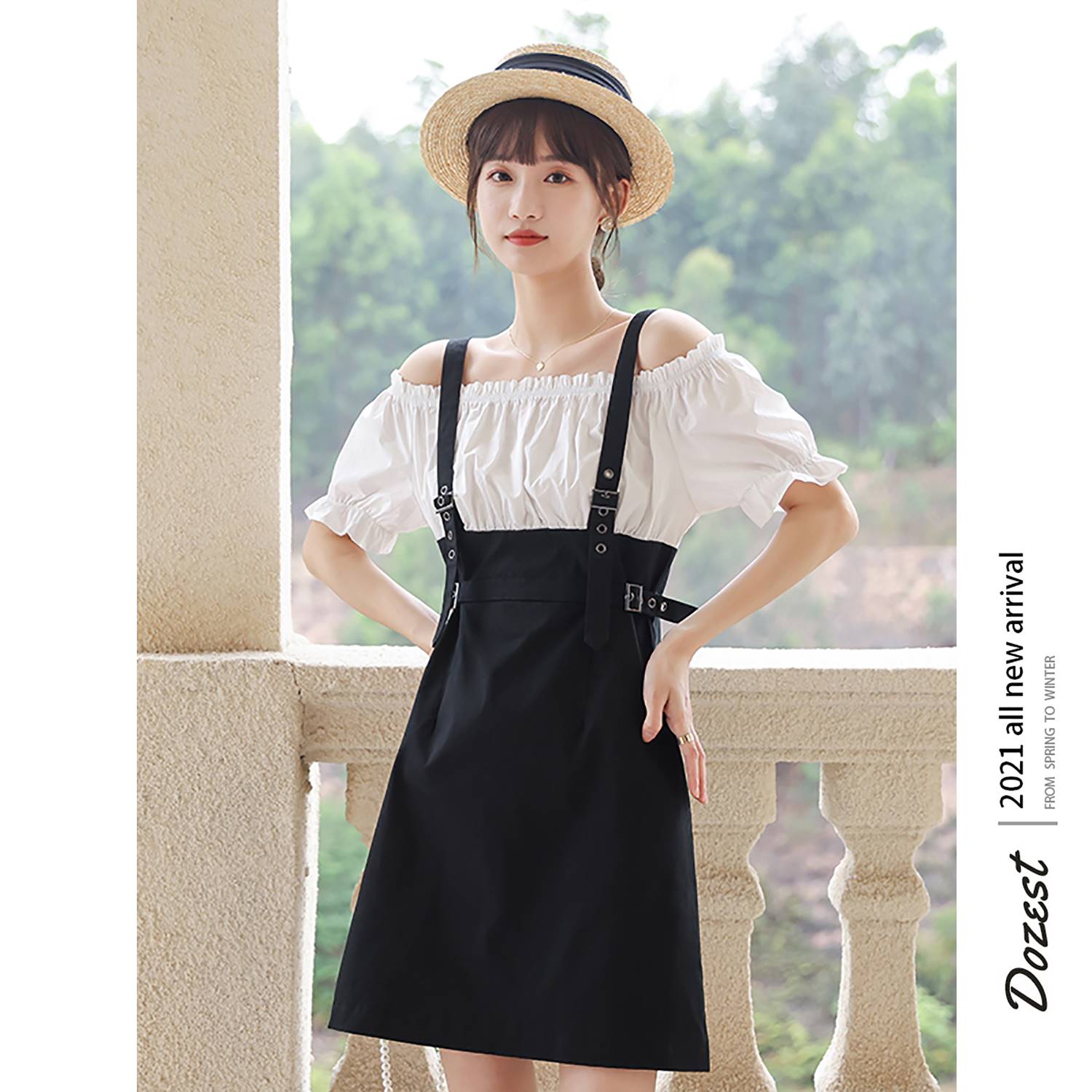 小清新假两件连衣裙女2021夏季新款吊带裙设计感一字领短袖A字裙热门设计联盟服务商