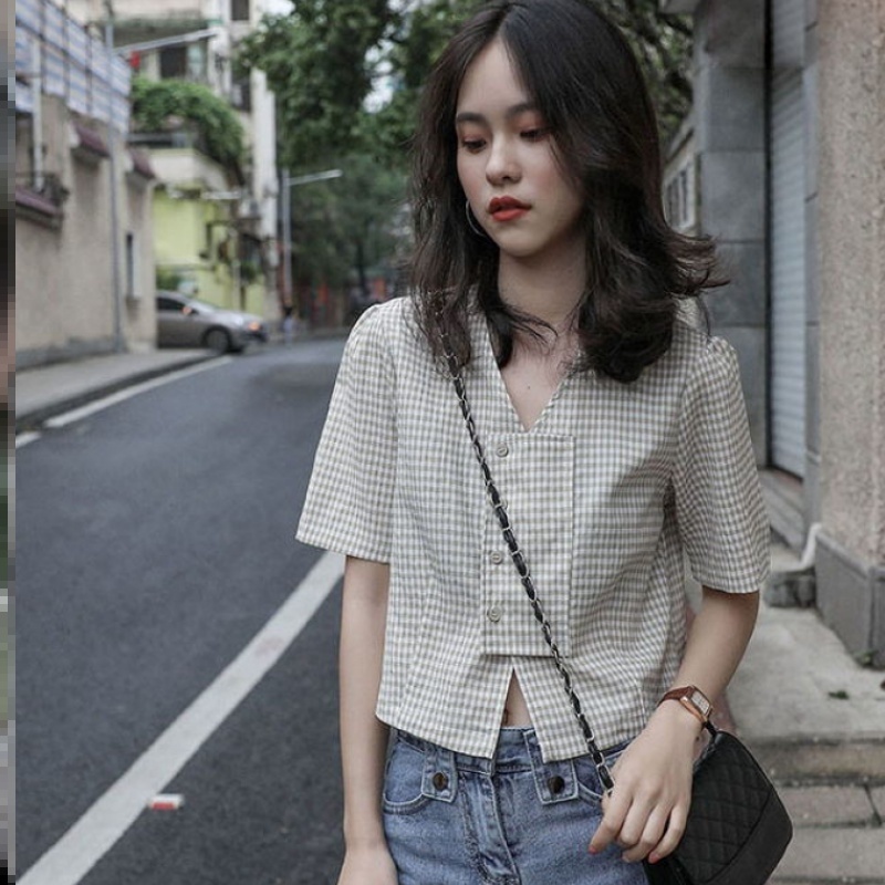 短袖格子衬衫女装夏装2020年新款时尚气质法式短款上衣设计感小众热门设计联盟服务商